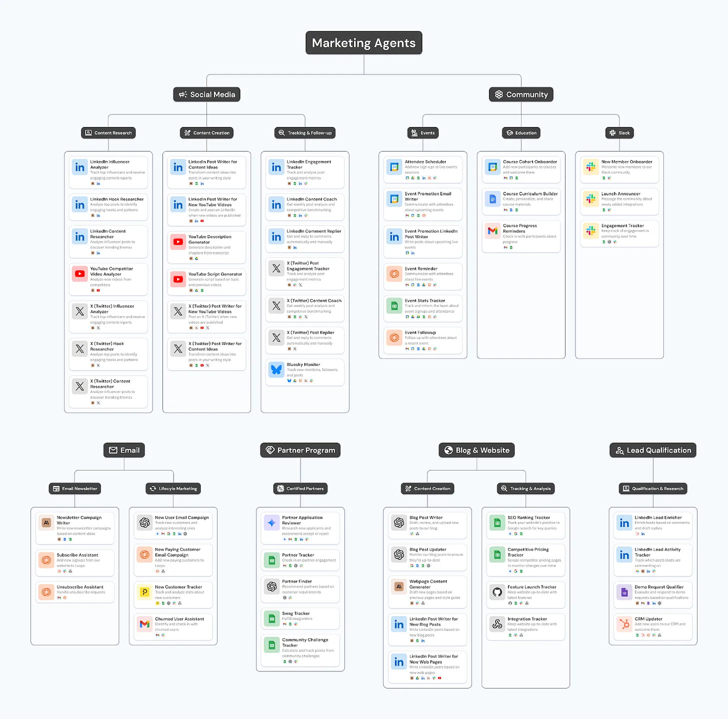 Every agent had a defined role — content repurposing, newsletter scheduling, partner outreach, community engagement, trend research. It wasn’t a speculative roadmap. It was his actual marketing team. No copywriters. No social media managers. Just agents.